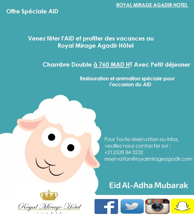 Continue to enjoy the sun and good weather in August in All Inclusive or BB with entertainment and attractions for an unforgettable stay at the Royal Mirage Agadir. Single Room BB 1210 dirhams and All Inclusive to 1485 dirhams. Double room in BB to 1375 dirhams and All Inclusive 1650 dirhams. Children Conditions: A baby less than 2 years and a child under 5.99 years will stay free of charge when sharing the bed with parents. A supplement of 250 dirhams per night will factura for children aged between 6 and 12 years.